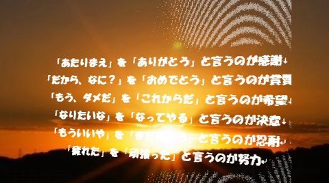 元気が出る言葉 当たり前をありがとうと言うのが感謝 だから何をおめでとうと言うのが賞賛 もうダメをこれからだと言うのが希望 なりたいなをなってやると言うのが決意 もういいやをまだ待とうと言うのが忍耐 Http T Co Ikn7hd5tw8 Http T Co Eimohjhg0v
